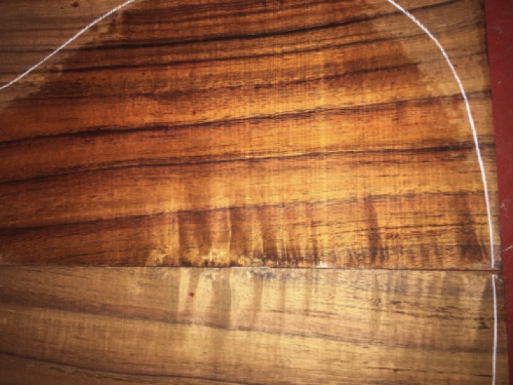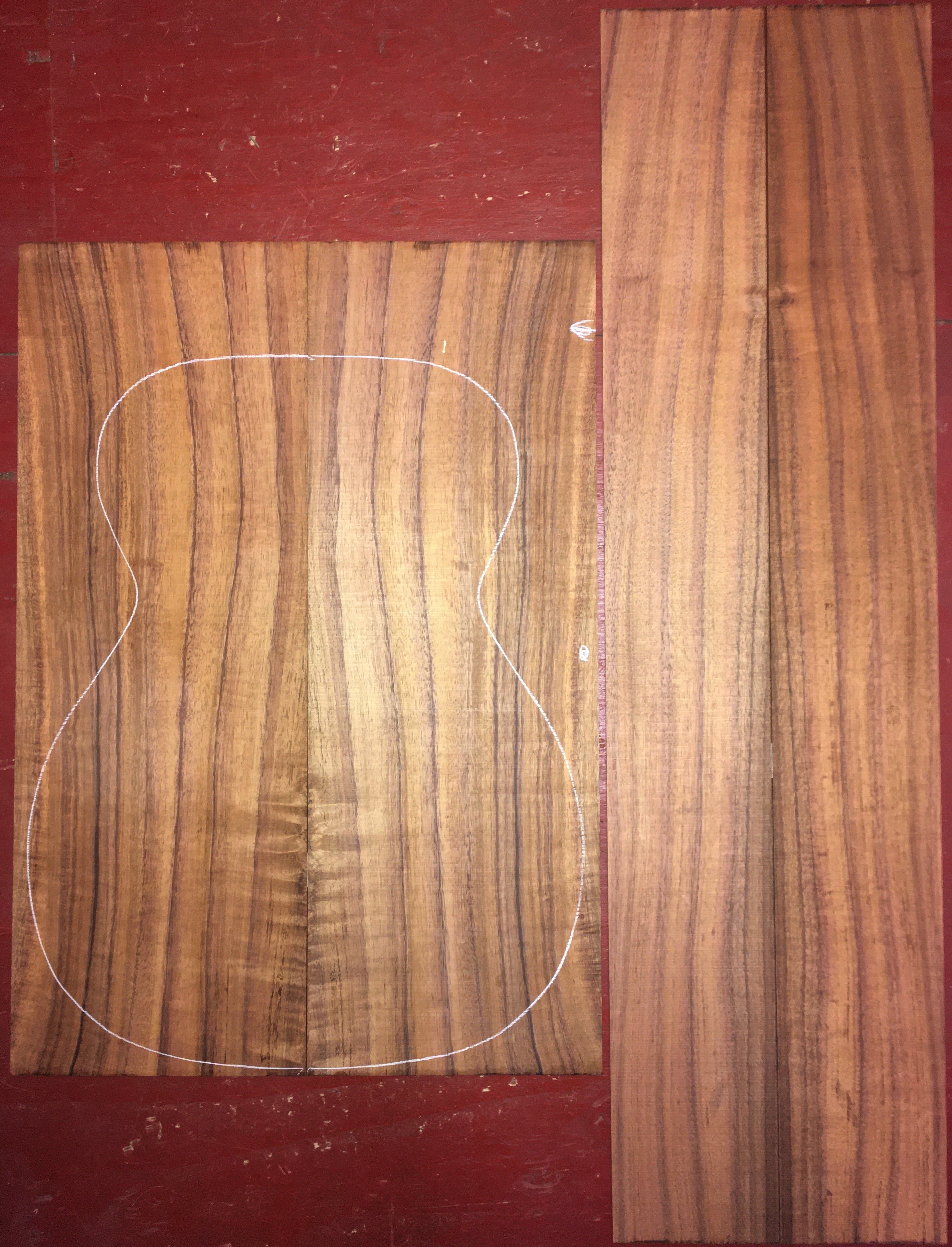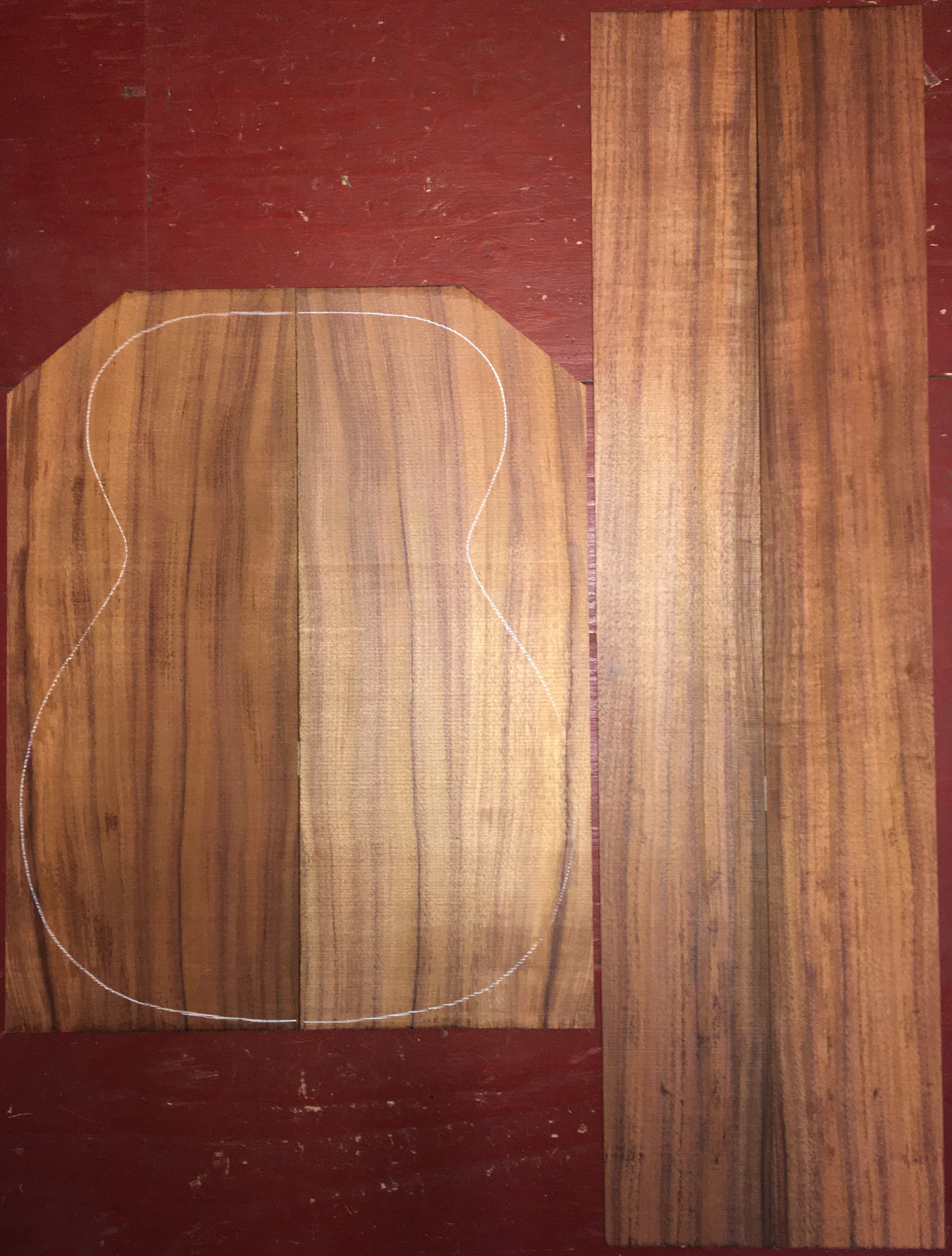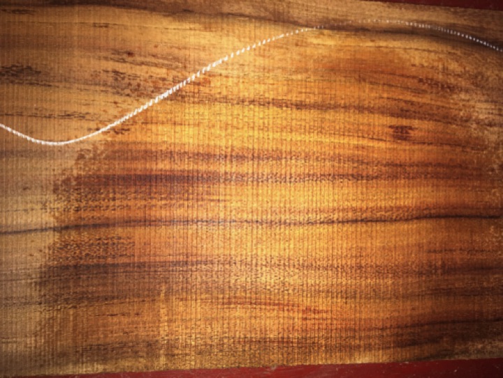 Air dried since 2016, 12-1/4" parlor pattern shown, rich color, vertical-straight grain with good curl. Old-school koa.