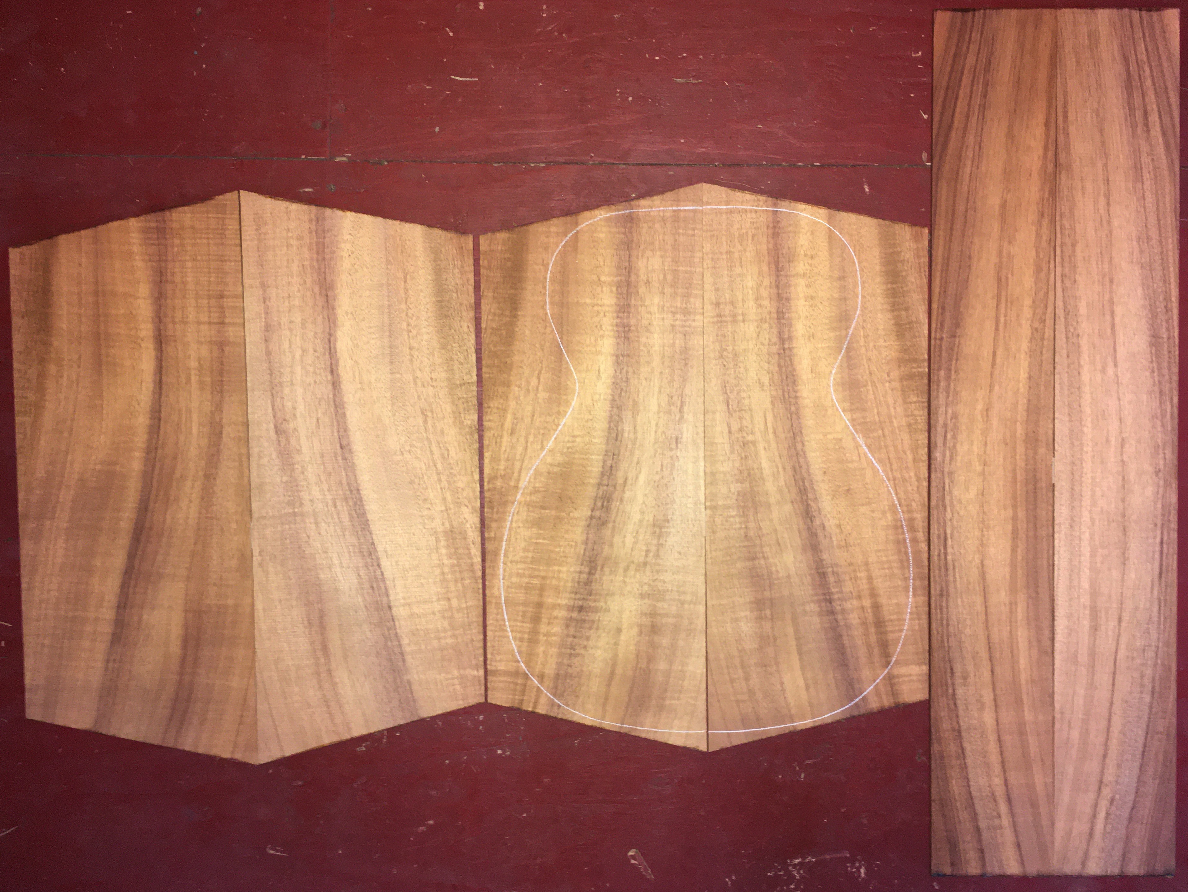 Air dried since 2010, 15-1/4" OM pattern shown, vertical grain, stripey red-brown with healthy sap at center joint.