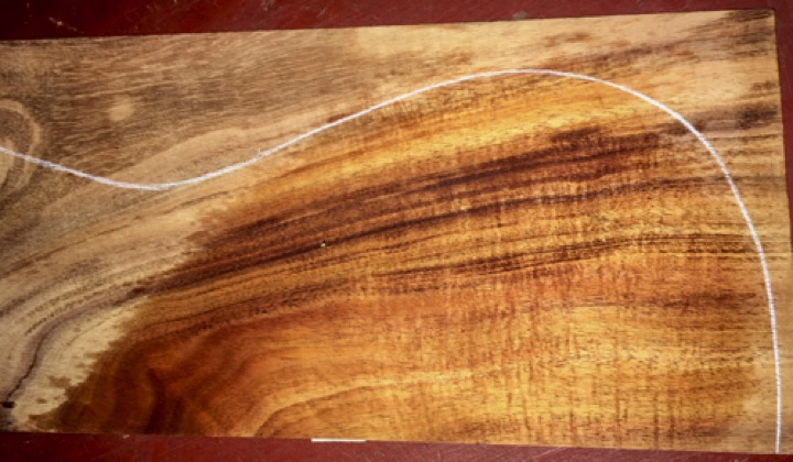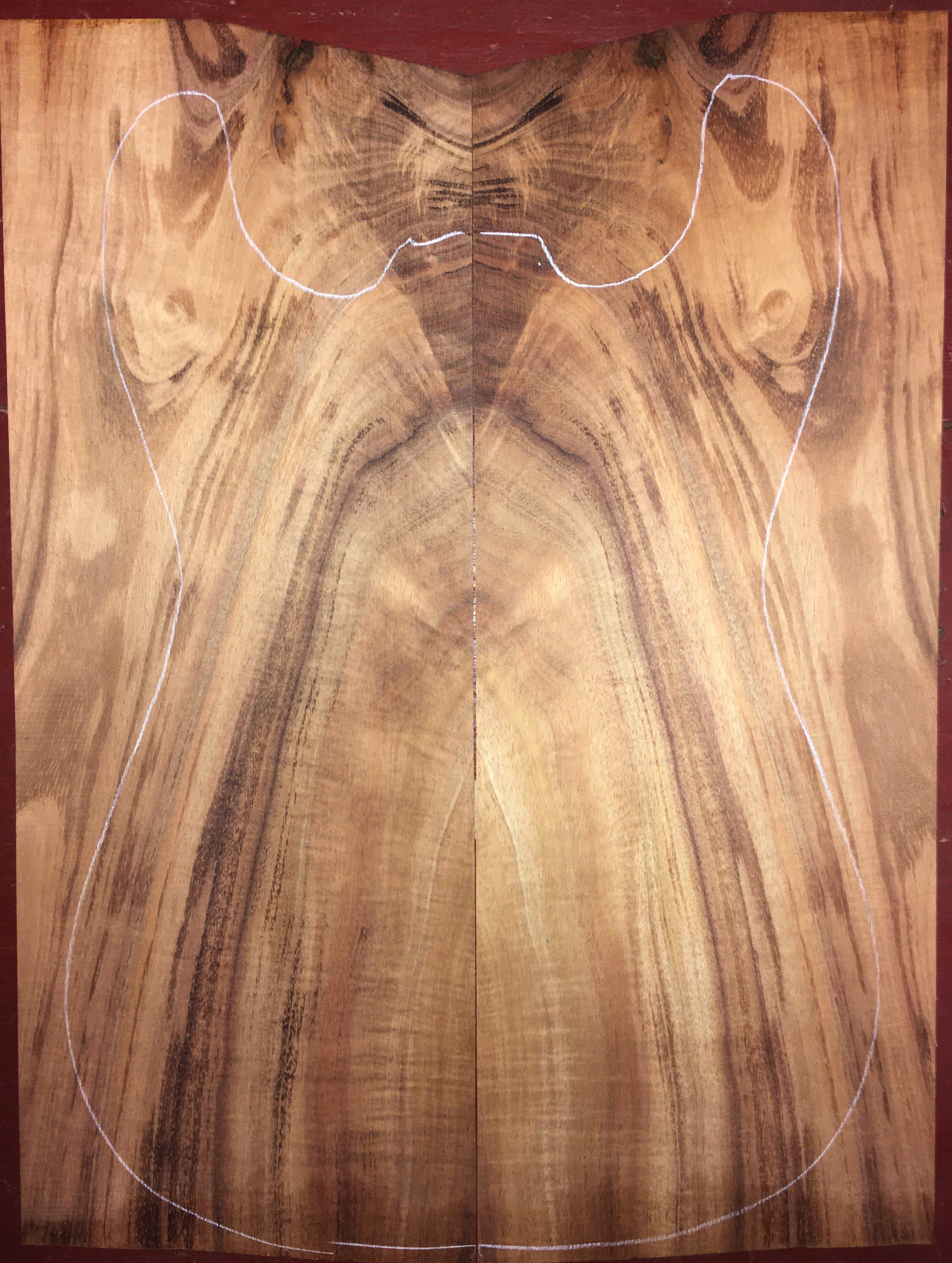 $240 top discounted due to tight knots and a split at the upper horn, marked with white line. Split easily repaired when gluing to a solid body.