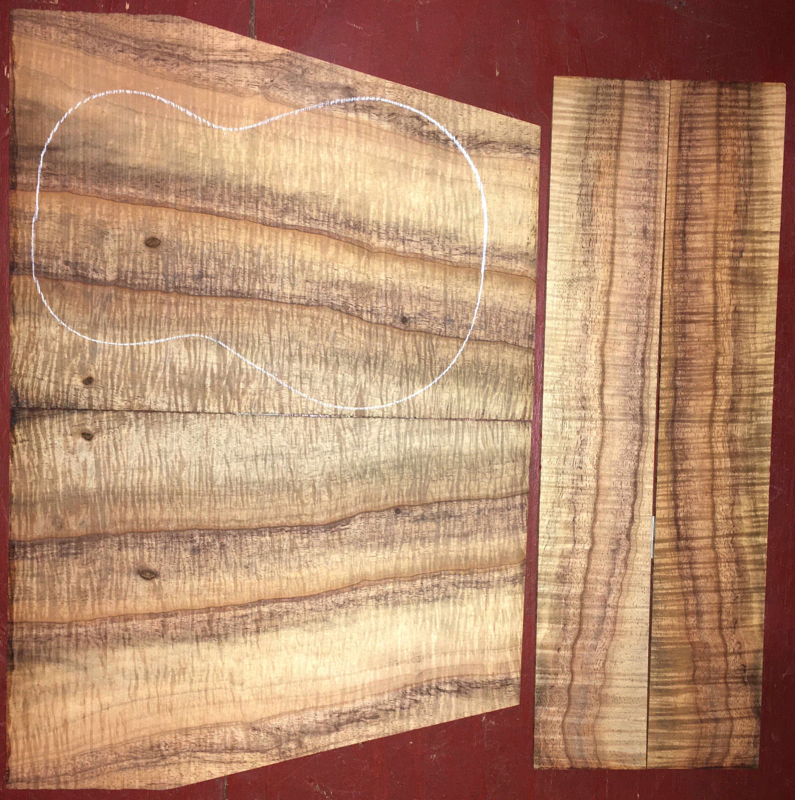 Two open knots on top/back. For 1-piece top/ back, larger knot could be under fretboard and would show on the back. You might be able to cut two bookmatches that avoid and/or hide both knots. Inquire for closeup photos.
