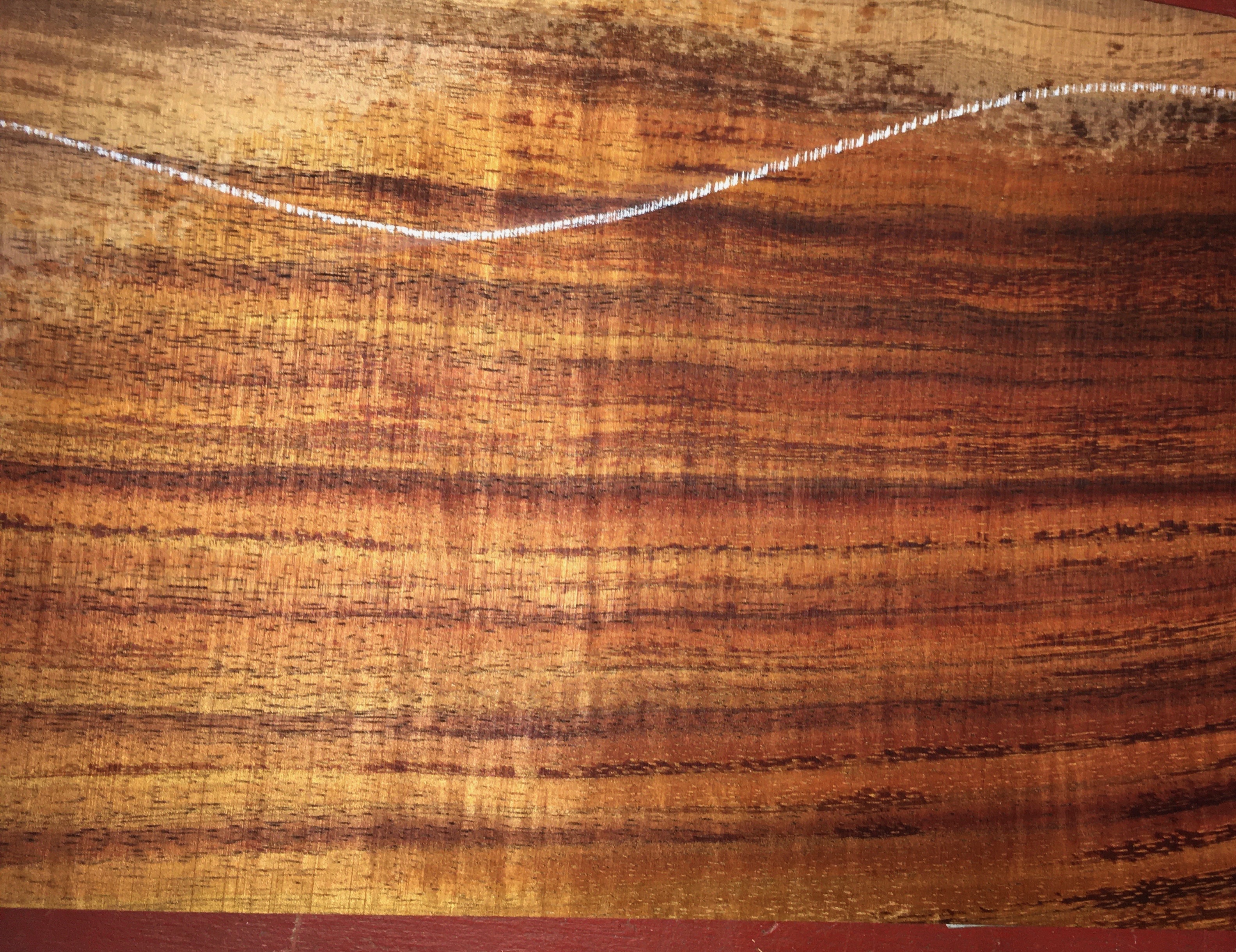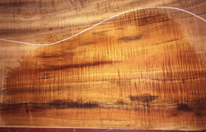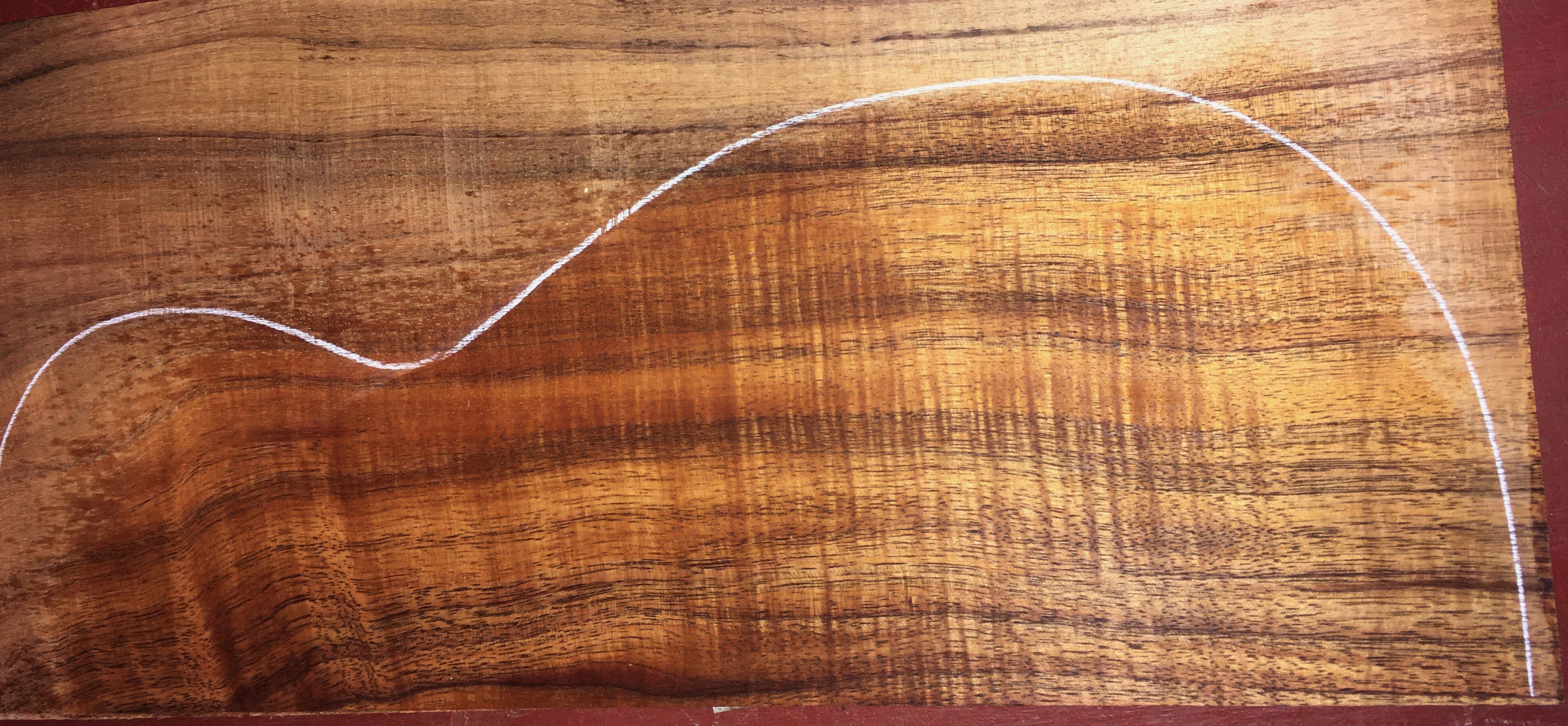 Air dried since 2016, 12-1/4" parlor pattern shown, rich color, vertical-straight grain with good curl. Old-school koa.