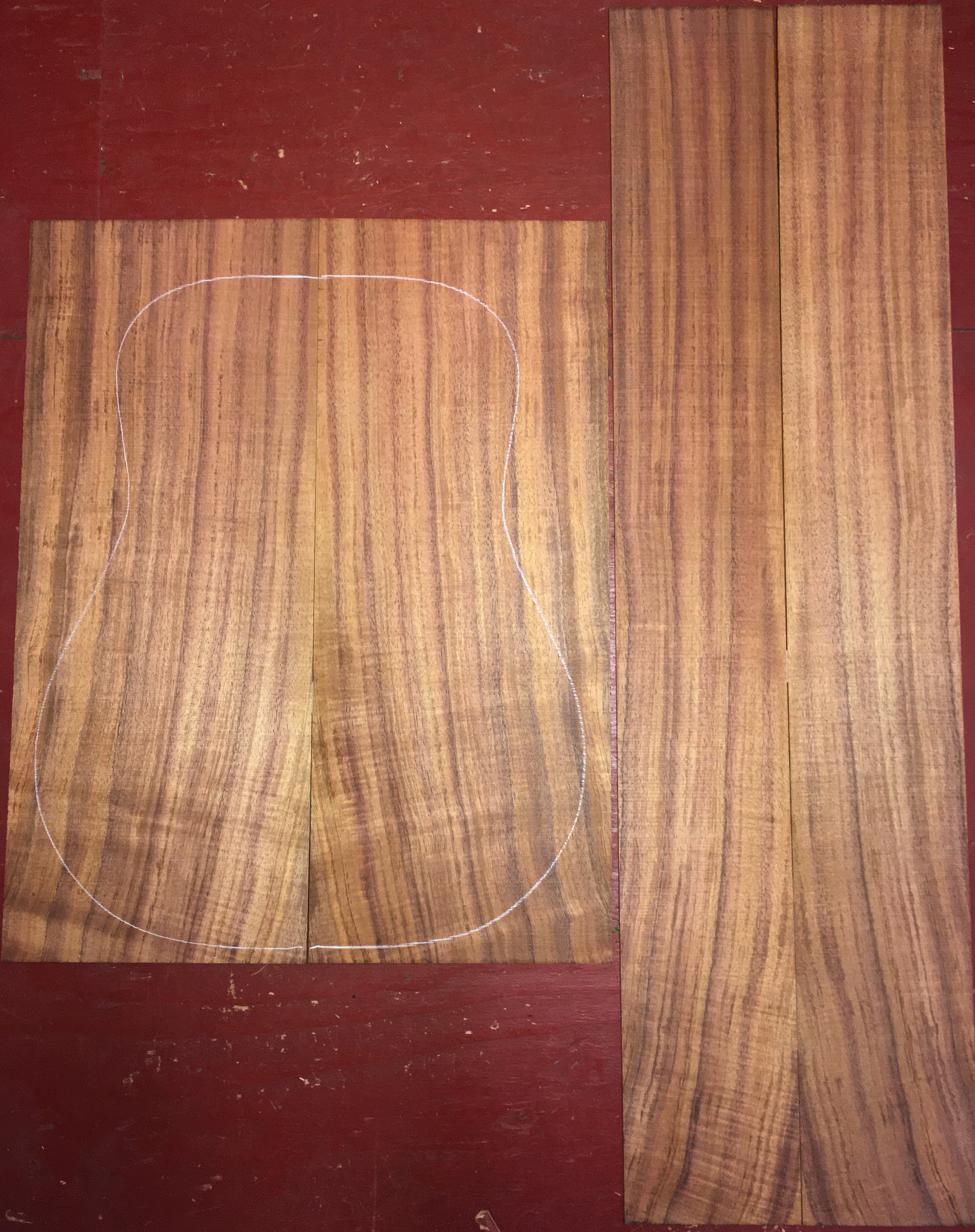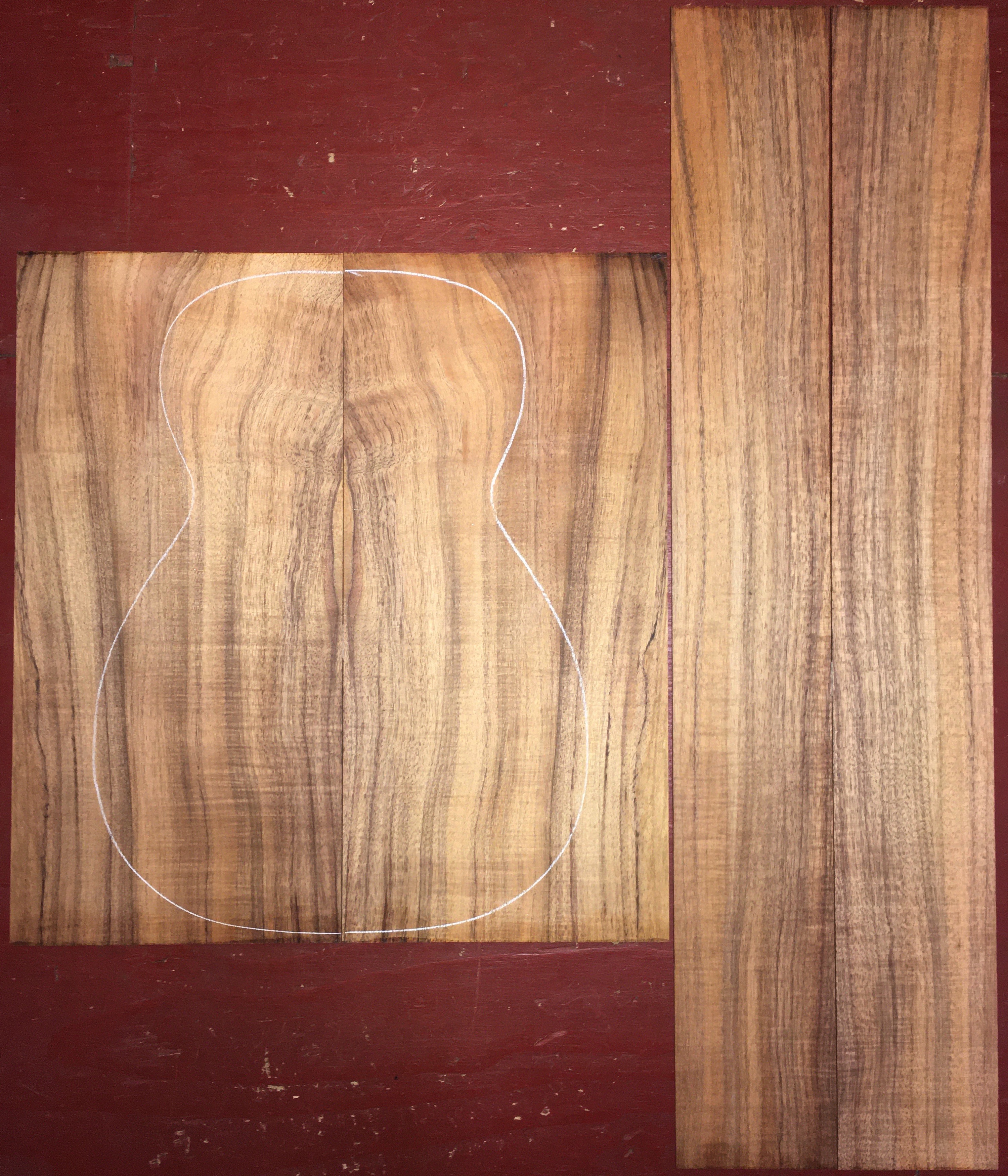 Back plates show an easy fit for OM; a standard dreadnought pattern is tight but doable. 3A curl on back, 2A+ curl on sides.