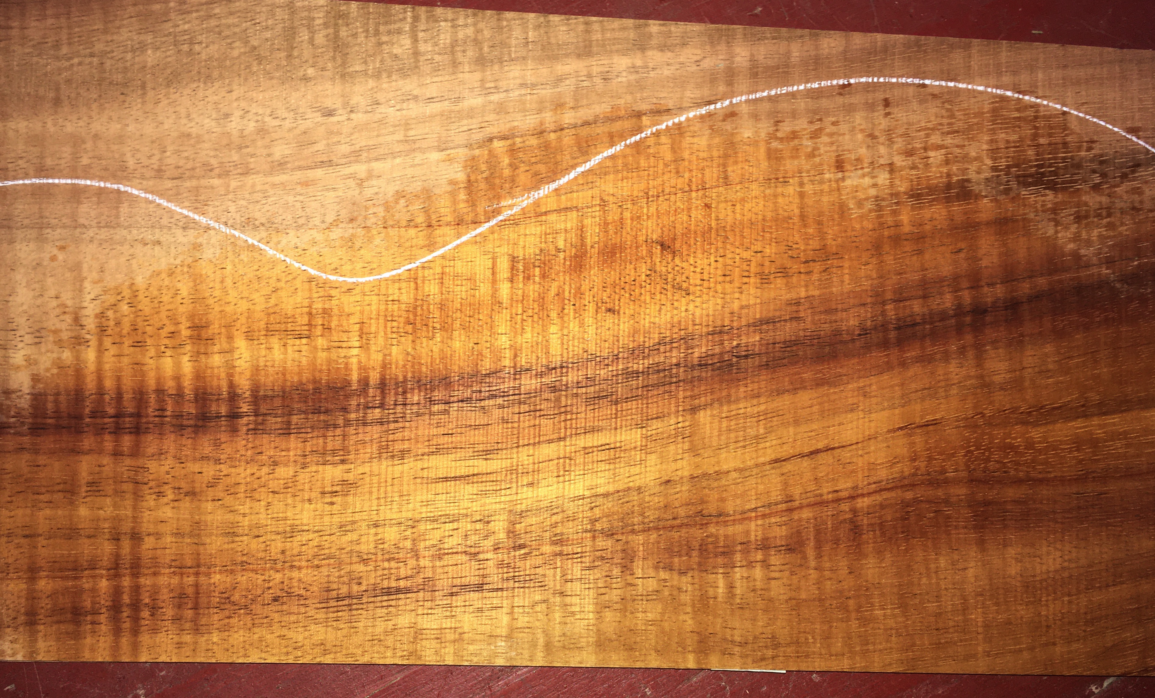 Light spalting on one of the two consecutive top/back bookmatches, seen closeup above. Handsome, healthy koa.