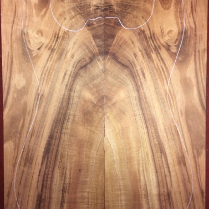 Sawn to nominal .200" thickness. 13" x 18-1/2" pattern shown; rich color, pommele quilt, light spalting. All solid koa.
