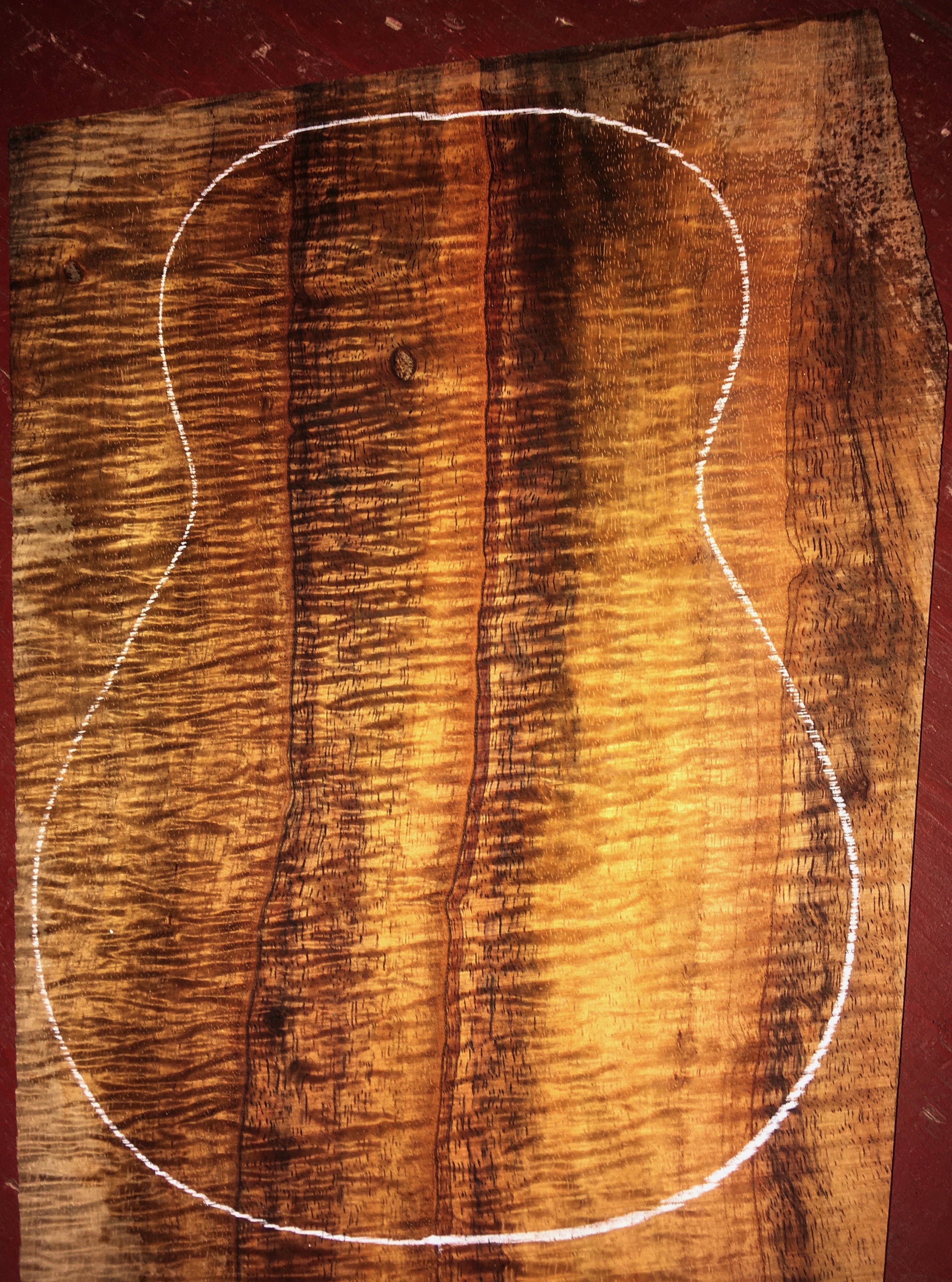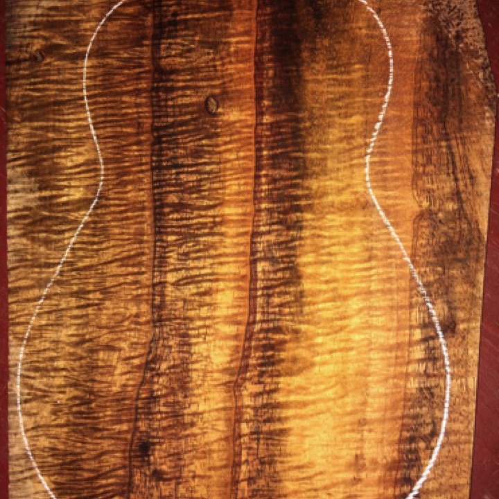 Knot between waist and lower bout is tight and stable but could be filled. Pattern could be reversed to avoid the knot. Sides are straight grain. Gorgeous koa.