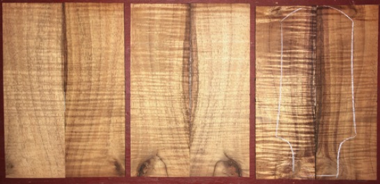 We have plenty of bookmatched koa headplates. These are rough-sawn plates, with minimum dimensions of 7-1/2" long, 1-3/4" wide (3-1/2" bookmatched), and .100" thick. Wider bookmatches and one-piece headplates available on request. Consider adding some to your next order.